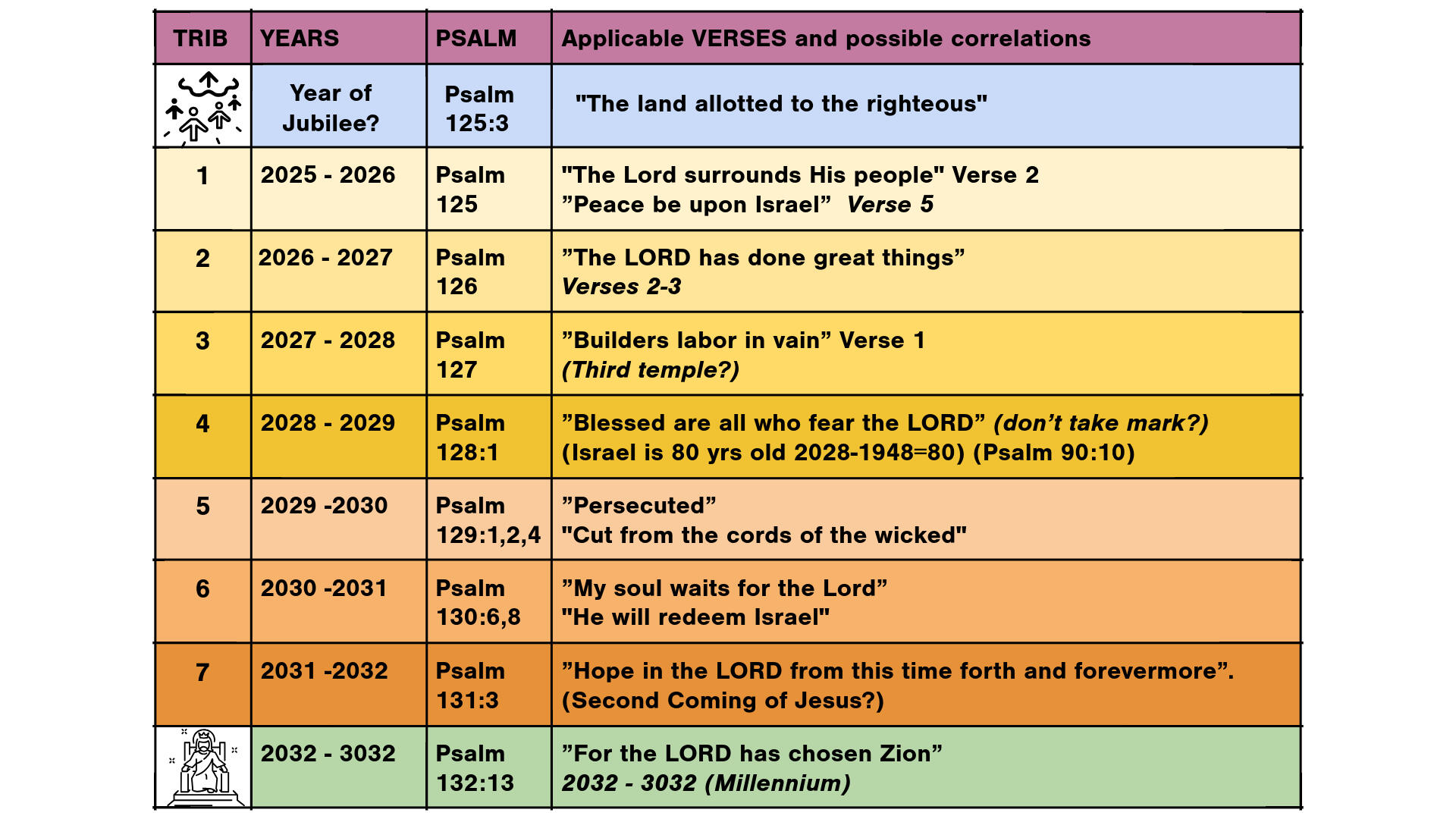 In 1986, Prophecy Publications published a book by J.R. Church from Oklahoma City, entitled, ‘Hidden Prophecies in the Psalms’. In it he shows the unique prophetic emphasis, as discovered by Patricia Berry, of certain prophetic events in a year corresponding with the Psalm of the same number. As in the year 1917 = Psalm 17, year 1948 = Psalm 48, year 2032 = Psalm 132 and so forth. The following chart shows some correlations that I see.
