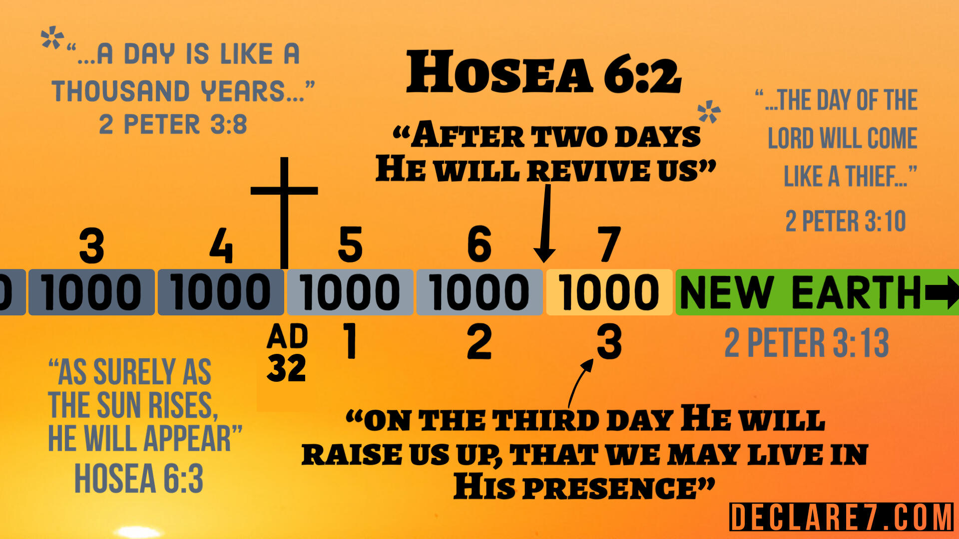“After two days He will revive us; on the third day He will raise us up, that we may live in His presence” (Hosea 6:2 BSB). Using the ‘day is like a thousand years’ principle, The Second Coming of Jesus would be AFTER two days or 2000 years. He died and was resurrected around 32 AD, so it seems the Second Coming would be around 2032 (around the 6000 year point). Some also think that the start date for the 2000 years is His Ascension because of Hosea 5:15. The seven years before it is the approximate start of the Tribulation. Also, it is good to note that the days could be shortened as mentioned in Matthew 24:22. The 1000 years after it is the Millennium (7000 year point/7th day of Creation - see the graphics).